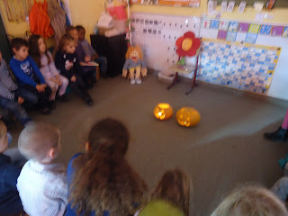 Op maandag begonnen we de dag met een vertelrondje. Heel veel kleuters hadden iets meegebracht in verband met Halloween. Dit mochten ze tijdens het vertelrondje aan alle andere kleuters vertellen maar natuurlijk ook tonen.