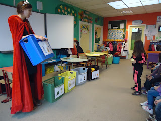Na de speeltijd vond er een leuke verrassing plaats. We kregen bezoek van de prinses van 'Viesvuilland'. De prinses kwam ons vertellen dat haar land heel vies en vuil was en graag zou ze daar een oplossing voor vinden. Omdat onze kindjes op onze school alles zo proper houden wou de prinses wel eens weten hoe wij dat doen. Dit door te sorteren! Kijk maar eens mee naar dit leuk avontuur!